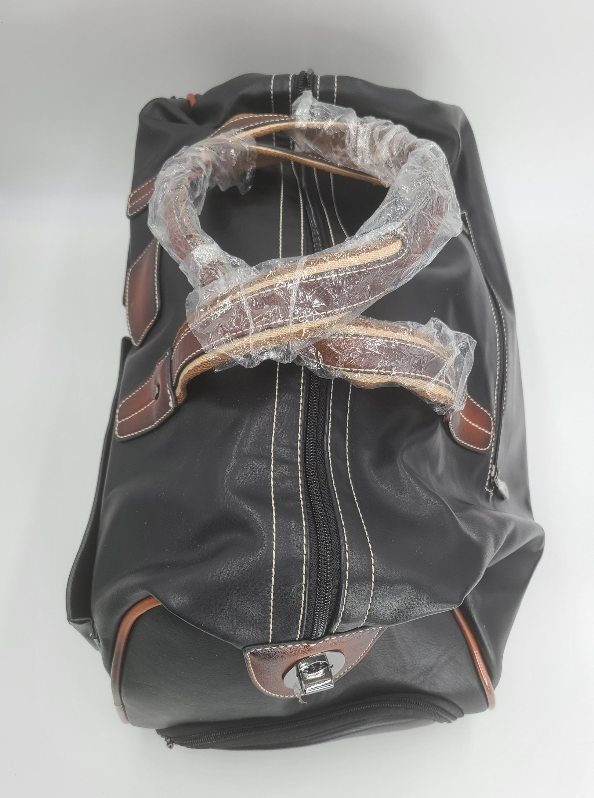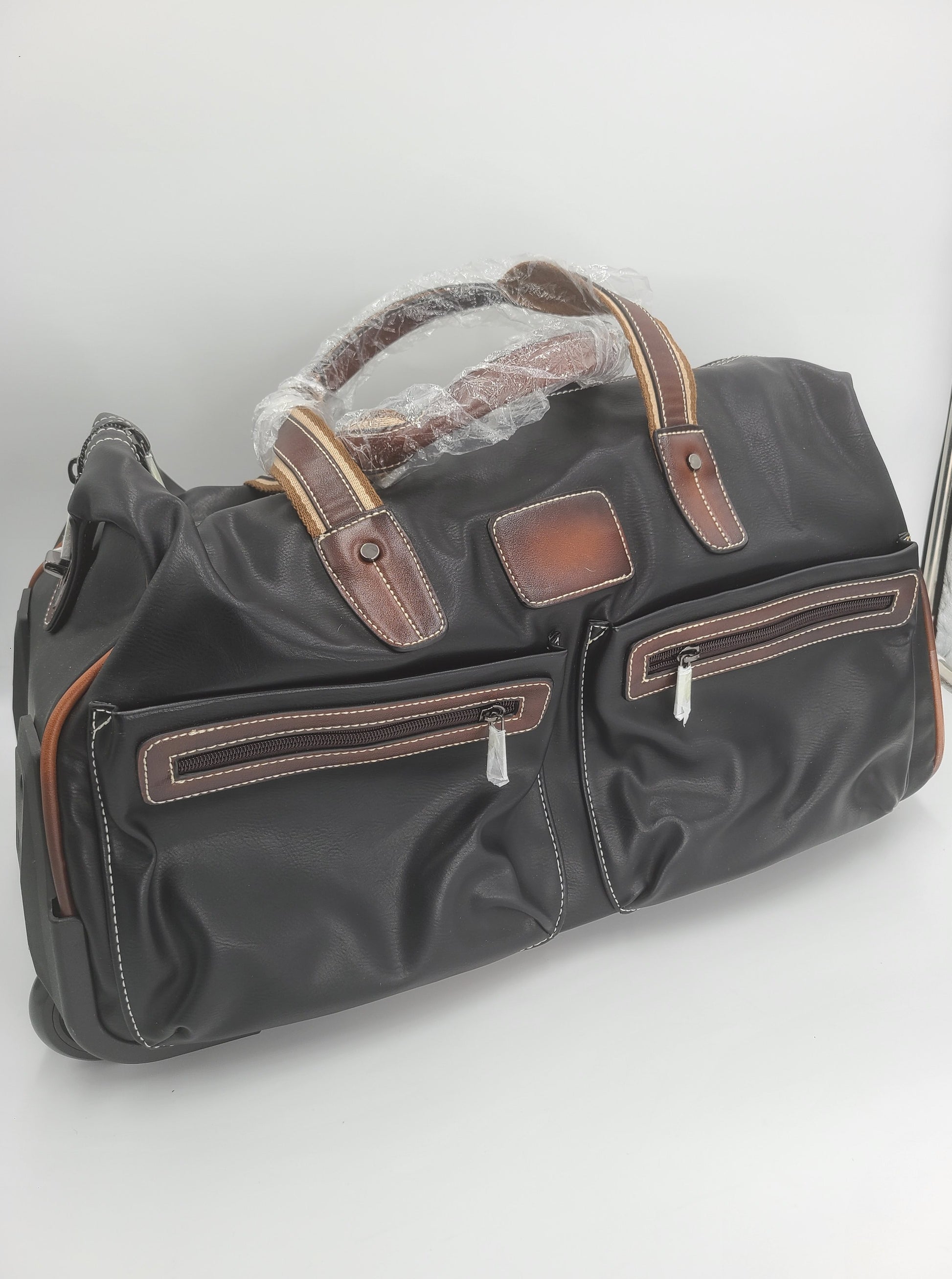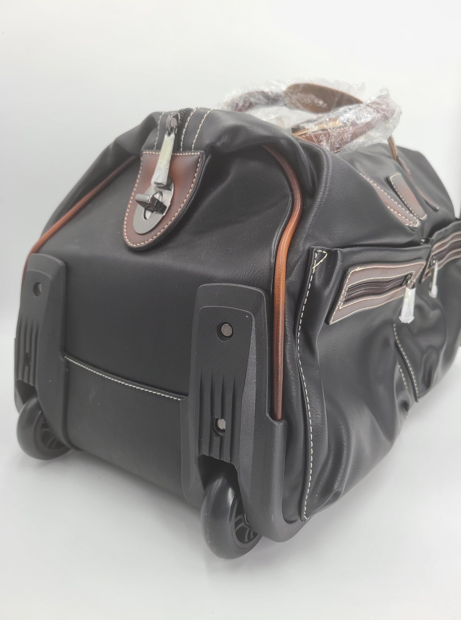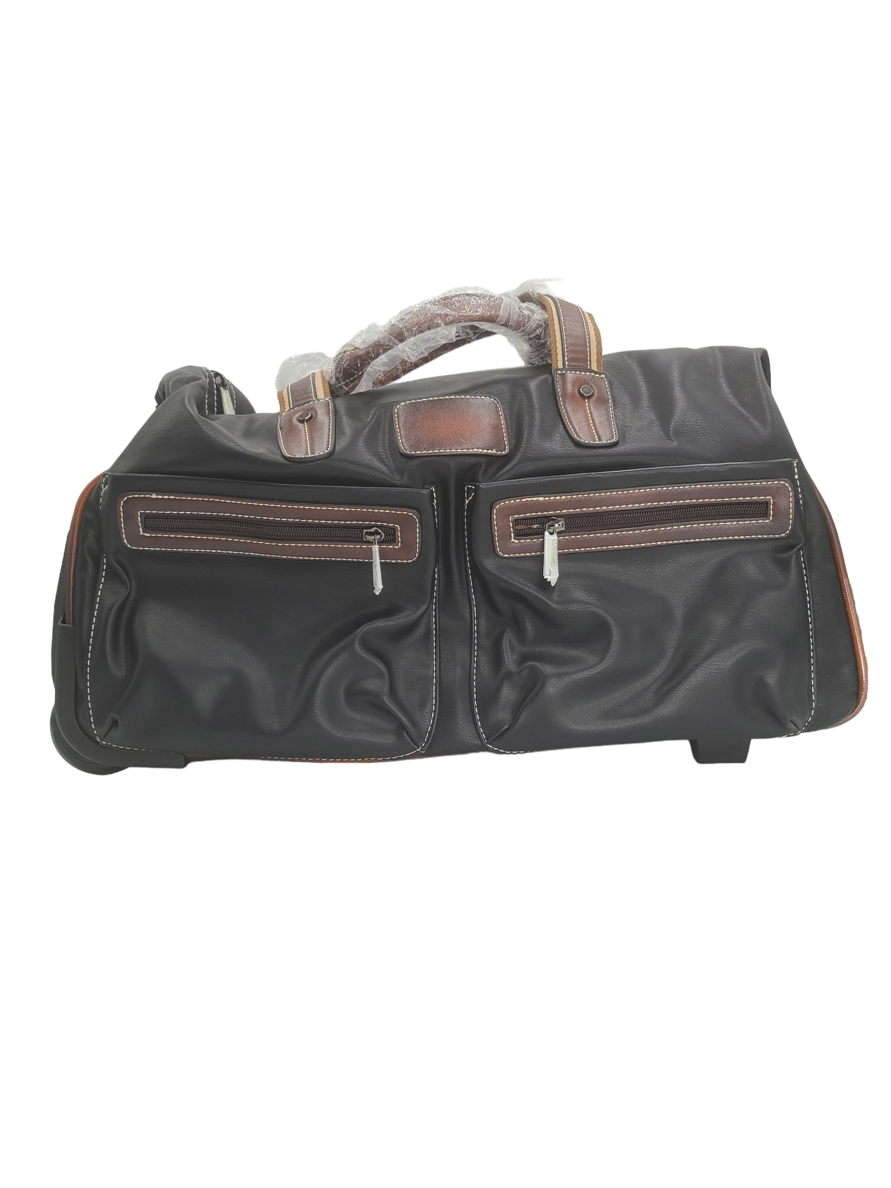Stylish black and brown faux leather travel duffel bag with wheels. If you are looking for something sleek and stylish that can be and carry-on or road trip ready this is the duffel bag for you. Spaces and ready to roll.
