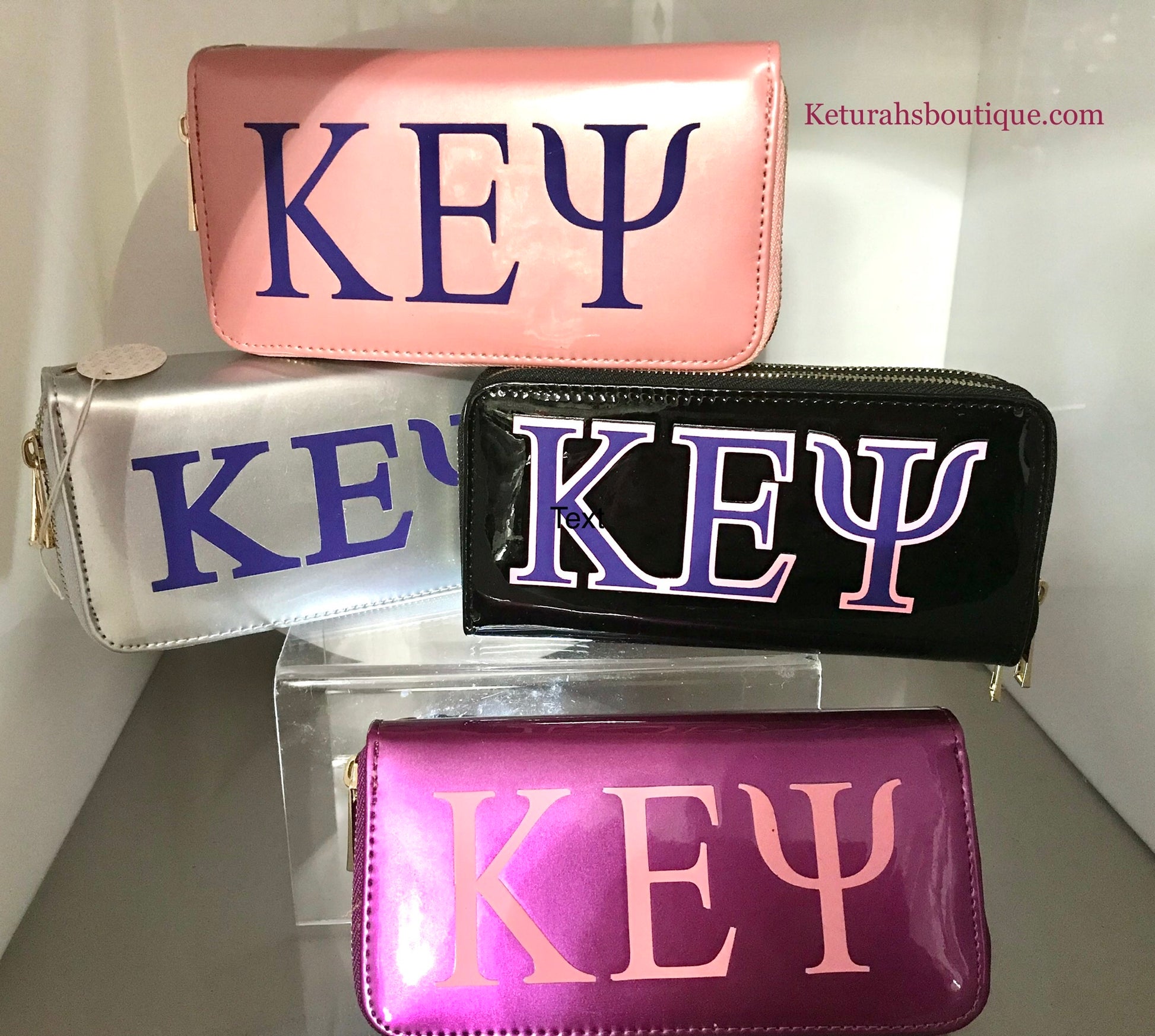 Kappa Epsilon Psi, wallet with multiple compartments, comes with strap for easy carrying. This wallet has a shinny leather finish.